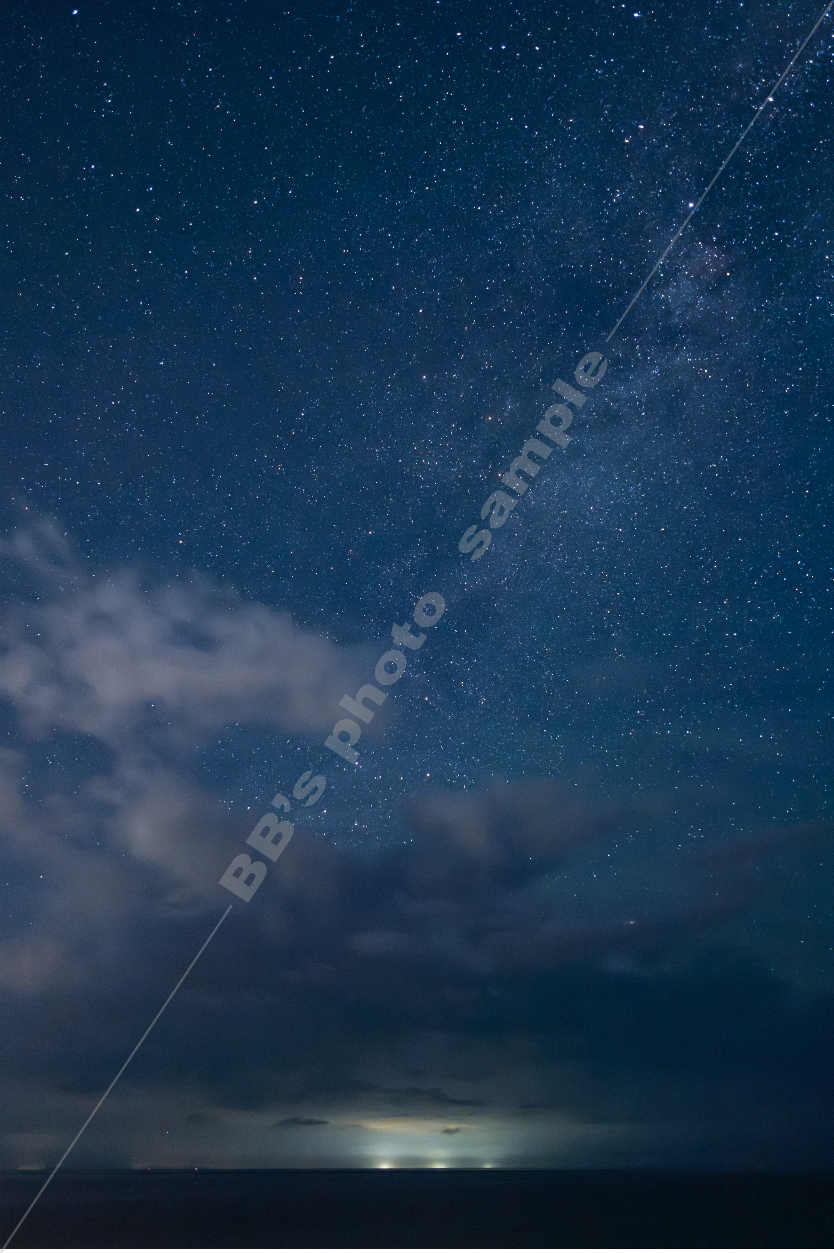 志賀町の高浜に友人を尋ねた帰りの海に漁船の集魚灯が見えていたので星と一緒に。